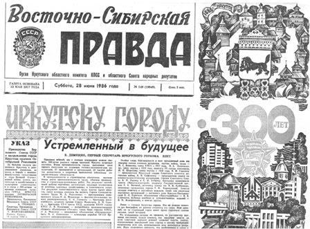 «Молодым, энергичным, полным сил и творческого стремления воплотить в жизнь решения XXVII съезда партии вступает в свой четвёртый век главный город Прибайкалья. Огромный трудовой подъём в этом крупнейшем индустриальном, научном и культурном центре Восточной Сибири вызвало известие о его награждении орденом Октябрьской Революции. Этой награды Иркутск удостоен за большие заслуги трудящихся в революционном движении, их вклад в борьбу с немецко-фашистскими захватчиками в годы Великой Отечественной войны, успехи, достигнутые в хозяйственном и культурном строительстве, и в связи с 300-летием присвоения ему статуса города. Сегодня состоялось торжественное представителей партийных, советских и общественных организаций, трудовых коллективов, посвящённое вручению награды Родины. На собрании выступил член Политбюро ЦК КПСС, секретарь Центрального Комитета партии Л.Н. Зайков». Так 28 июня 1986 бодро и наступательно – в стиле тогдашнего официоза – описывал ТАСС (Телеграфное агентство Советского Союза) торжественную часть этого праздника. Так во второй раз за всю историю Иркутск ярко и размашисто отмечал свой юбилей.