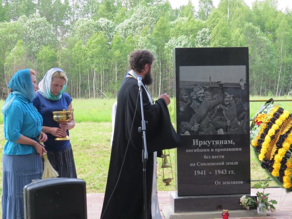 Во время открытия памятника членами иркутской делегации были зачитаны приветствия мэра города Иркутска Дмитрия Бердникова, мэра города Бодайбо Евгения Юмашева, обращение депутата Законодательного Собрания Иркутской области Андрея Лабыгина, чей дед, Перелыгин Семён Тимофеевич, погиб на Смоленской земле в 1943 году. После освящения памятника настоятелем Благовещенской церкви города Демидова отцом Анатолием и молебна по погибшим воинам-иркутянам состоялась церемония возложения к памятнику венков. Среди них был и венок от «земляков».