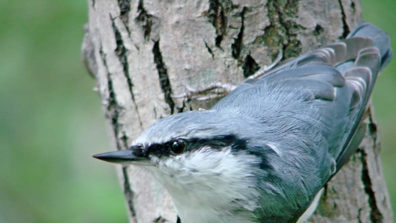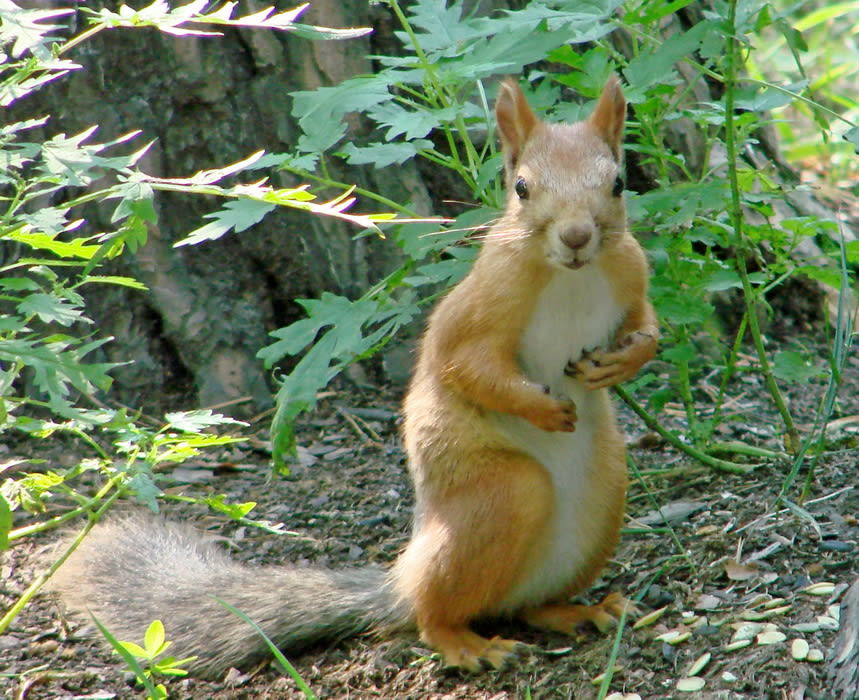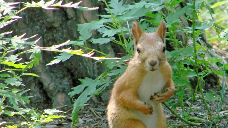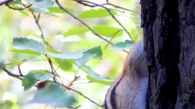 Выждав успокоительную паузу, медленно-медленно, продолжая гипнотизировать бурундука взглядом и не поднимая фотоаппарат с колен, поворачиваю объектив в сторону лесного жителя. Так же медленно, бесшумно открываю, поворачиваю рабочей поверхностью вверх дисплей видоискателя. Потом, будто потеряв интерес к полосатику, медленно опускаю глаза к дисплею… Фотоаппарат простенький. Не зеркалка. Снимая, тишины не разрушает. Есть кадр. И ещё. Ну, и ещё один, на всякий случай. Так же медленно вновь поднимаю глаза и замечаю, что пружина-то в полосатом тельце ослабла. В «гляделках» бурундук признал себя победителем и, уже не слишком опасаясь, сорвал лапкой (так и хочется сказать – рукой) стручок мелкого лесного горошка. Сунул его в пасть, но есть не стал. Полез зачем-то на берёзу. На всякий случай с противоположной от меня стороны ствола. Поднявшись невысоко, выглянул посмотреть, что делает побеждённый великан, и – стрелой куда-то в крону. Наверное, завтракать.