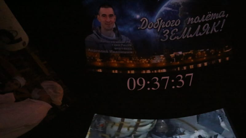 Прямая трансляция в Иркутском планетарии была включена за 6 минут до старта. На экране – кабина космического корабля. Космонавты в скафандрах на своих местах, в центре – Анатолий Иванишин. В руках у него что-то вроде указки. В кабине очень тесно, космонавты находятся в лежачем положении. «Указка» нужна для того, чтобы дотянуться до отдельных органов управления кораблём. Анатолий Иванишин спокоен, по его товарищам видно, что они немного волнуются – они летят в космос первый раз.