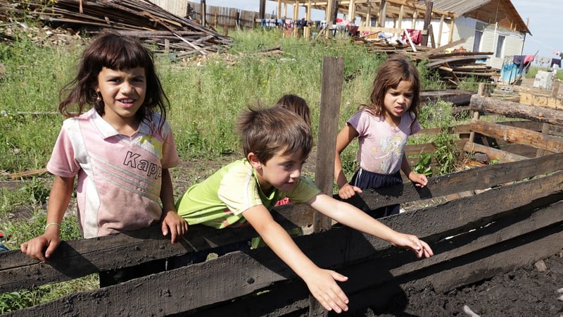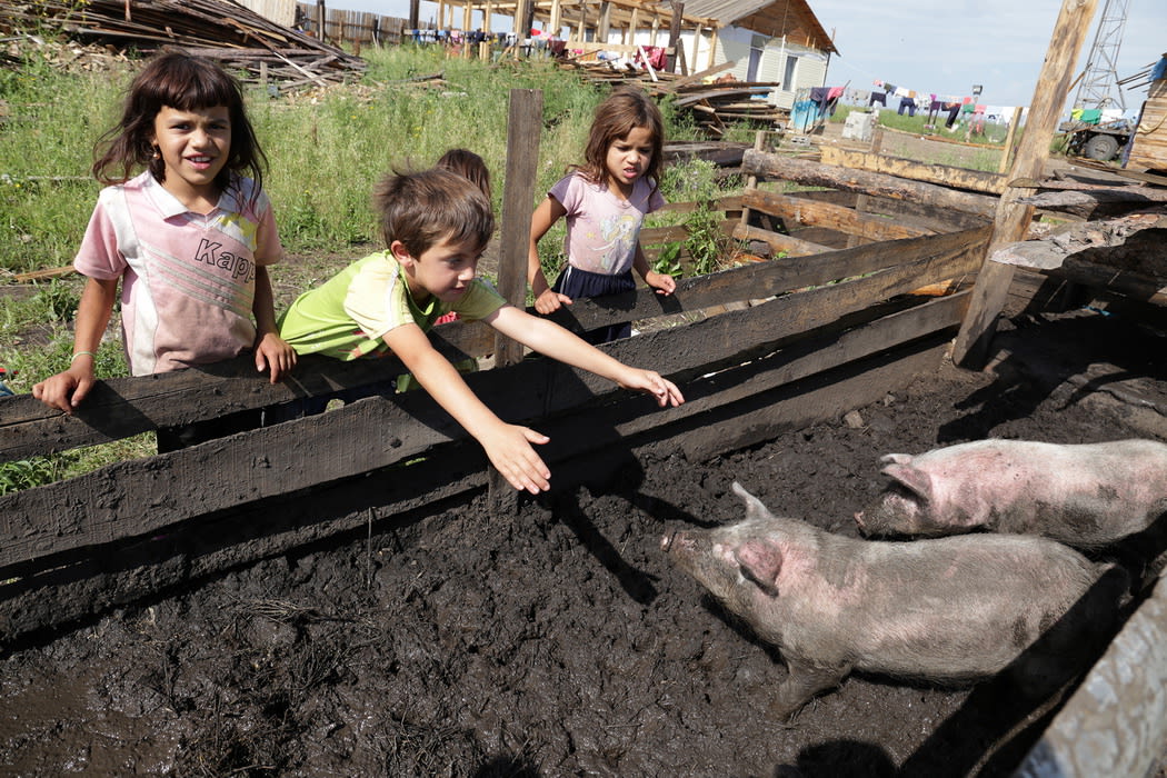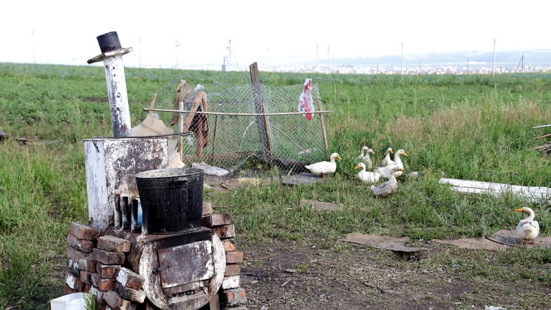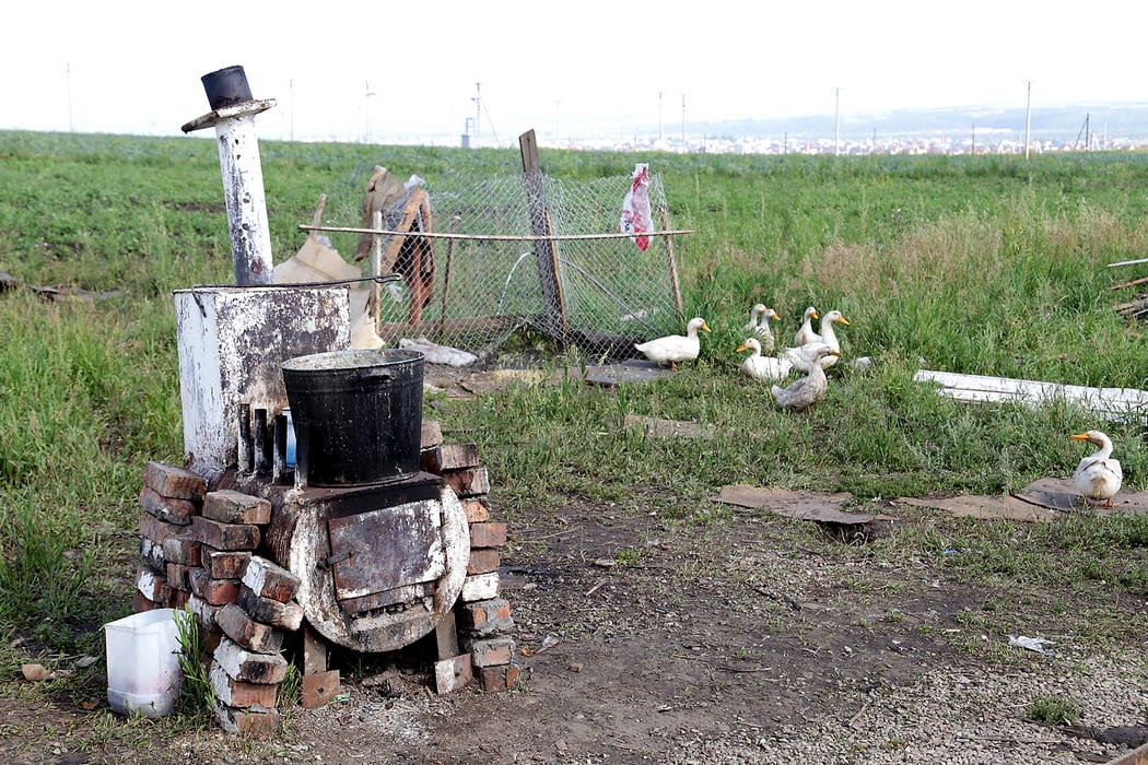 По двору степенной стайкой бродят гуси, беспорядочно носятся заполошные куры, где-то рядом слышится ленивое хрюканье свиней. Между этой живностью снуют многочисленные чумазые и целеустремлённые цыганята. Одна, как сорока, хватает цепкими пальцами с обгрызенными ногтями диктофон и нахально прищуривается: «Дяденька, подари, а?» Женщины гортанными цыганскими возгласами отгоняют их на безопасное расстояние.