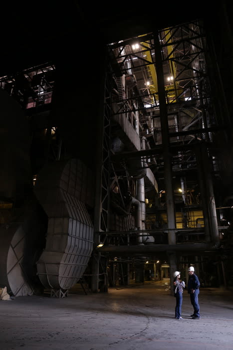 В цехе, как в шахтах, высота измеряется не этажами, а метрами. Рассказывая о работе цеха, наш провожатый подходит к лестничному трапу. За перила лучше не хвататься просто так – они покрыты тонким слоем золы, хотя совсем недавно здесь была влажная уборка. Чувствуется вибрация, площадка лестницы словно дрожит.