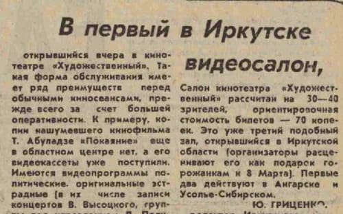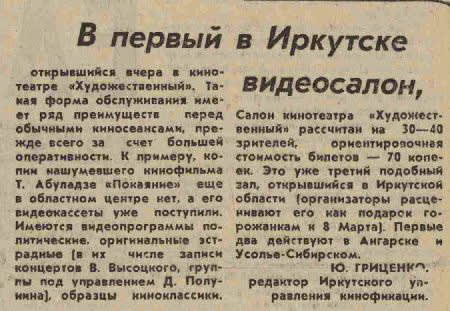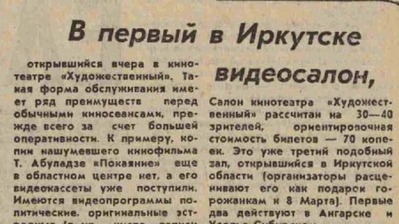 Когда стало понятно, что кампания 1982–1985 годов против «распространения порнографии» посредством видео не остановит интереса людей к мировой кинокультуре, «павианов» попытались одомашнить, и в 1987 году появились официальные видеосалоны. Одним из них и был салон в иркутском кинотеатре «Художественный». «Имеются видеопрограммы политические, оригинальные эстрадные (в их числе записи концертов В. Высоцкого, группы под управлением Д. Полунина), образцы киноклассики», – сообщала газета. Зальчик в «Художественном» был рассчитан на 30–40 мест, цена билета – около 70 копеек. Первый фильм был идеологически выдержанным – «Без срока давности». А сам салон позиционировался как «большой удар для всякого рода «жучков» с собственными видеомагнитофонами и контрабандными записями». Однако стоит признать, что пионером официального видеокино в области был Ангарск, а не Иркутск. В 1987 году салоны были открыты в этом городе, а также в Братске и Усолье-Сибирском. Ангарский салон открыл двери в феврале 1987 года в кафе «Юность», его окрестили «видеокафе». Правда, цена была немаленькая – 4 рубля, поскольку в комплекте с видеосеансом шёл ещё и ужин. Программы были трёхчасовыми, и зрителями подавали, к примеру, бутерброды с икрой (сам сеанс стоил от 50 копеек до рубля). В Усолье, как сообщали газеты, помещение для видеосалона было запланировано прямо при строительстве нового жилого комплекса для молодожёнов. Первые фильмы в зале на 70 мест стали показывать в марте 1987 года. Старые газеты сохранили репертуар: «Воспоминание» (фильм о Высоцком), «Короткие встречи» Киры Муратовой. Молодёжь требовала «Легко ли быть молодым?», «Плюмбум». Была особая услуга: заказать фильм к свадьбе, ко дню рождения. После фильмов обычно планировалась дискуссия.