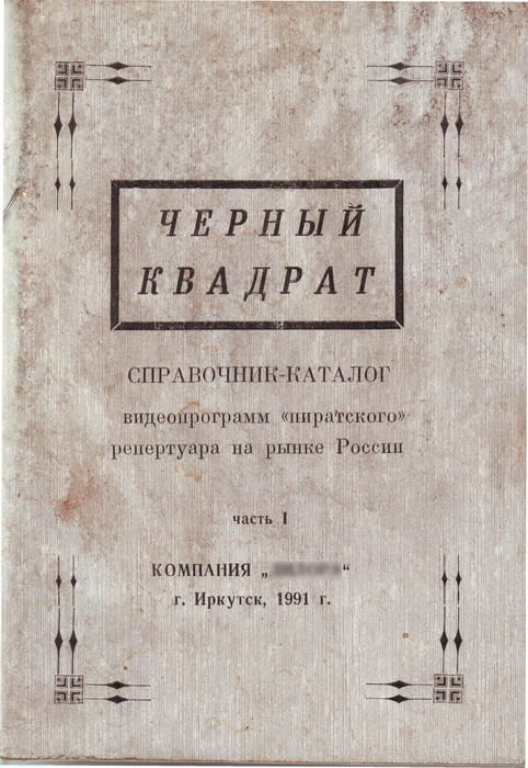 Артефакты недавнего прошлого могут подчас удивить ничуть не меньше, чем какая-нибудь вещичка неизвестного назначения из древнего кургана. Я держу в руках брошюру под названием «Чёрный квадрат», изданную в Иркутске в 1991 году. Читаю надпись: «Справочник-каталог видеопрограмм «пиратского» репертуара на рынке России». Это вполне официальный каталог нелегального видео, предварённый большой статьёй, которая может быть использована исследователями 1990-х и как образец публицистики «ужасных лет», и как бесценное свидетельство жизни «пиратского» видеорынка России и Иркутской области в девяностых годах прошлого века. Одним из ярчайших объектов тех лет был видеосалон, где можно было получить и видео с академиком Сахаровым, и с известным в своё время эротическим произведением «Эммануэль». Смотря куда зайти.