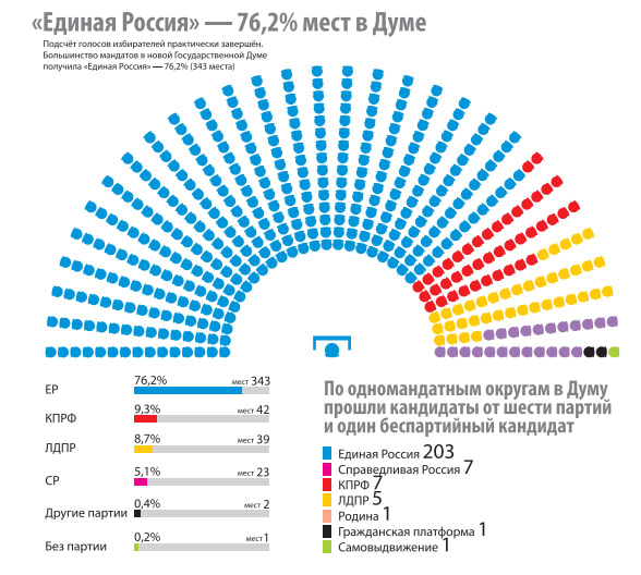 Кампания «Единой России» проходила при полной поддержке президента России Владимира Путина, и, когда стало ясно, что партия власти одержала победу на выборах, он и премьер Дмитрий Медведев прибыли в избирательный штаб «ЕР». Премьер высказал уверенность, что партия власти получит «абсолютное большинство» в новой Госдуме.