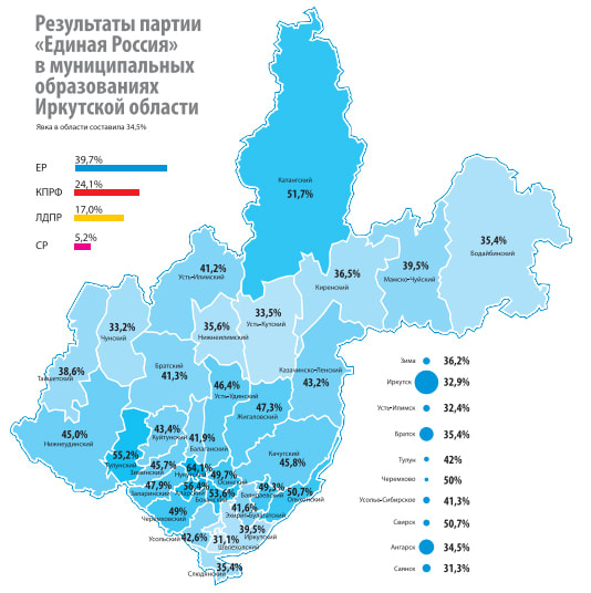 Аналогичная ситуация по Иркутской комиссии № 4, приписанной к Шелеховскому округу. Год назад – лидерство КПРФ, сегодня – равные позиции с «ЕР». Вряд ли люди, которые шли на выборы, поменялись. Изменилось их отношение к партиям и кандидатам. Разочарование в коммунистах и стабильный электорат «ЕР» сделали своё дело. По данным Иркутской городской комиссии № 3, «ЕР» опередила КПРФ почти на 5% (год назад именно здесь единоросс Сергей Ерощенко проиграл коммунисту около 35%). Иркутская комиссия № 1 насчитала 39,23% голосов за «Единую Россию» и 25,65% за КПРФ. Ещё в сентябре 2015 года коммунист Сергей Левченко сумел отвоевать здесь у соперника-единоросса почти 45%. Таким образом, Иркутск в целом проголосовал за «Единую Россию».