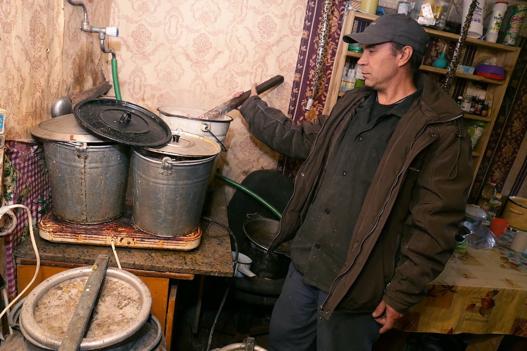 Зоозащитники правы и в том, что она готовилась к визиту: вольеры чисто выметены, на кухне готовится в вёдрах какое-то варево, из которого работник Саша с гордостью вылавливает половником куриные полутушки: «Я сам бы такое кушал!» Собаки ухоженные, с блестящей шерстью. Единственная странность – все одинаковые, словно одного возраста и даже похожи друг на друга ростом и внешним видом. Хозяйка называет их по именам – Малыш, Ласка, Старый, Герда…
