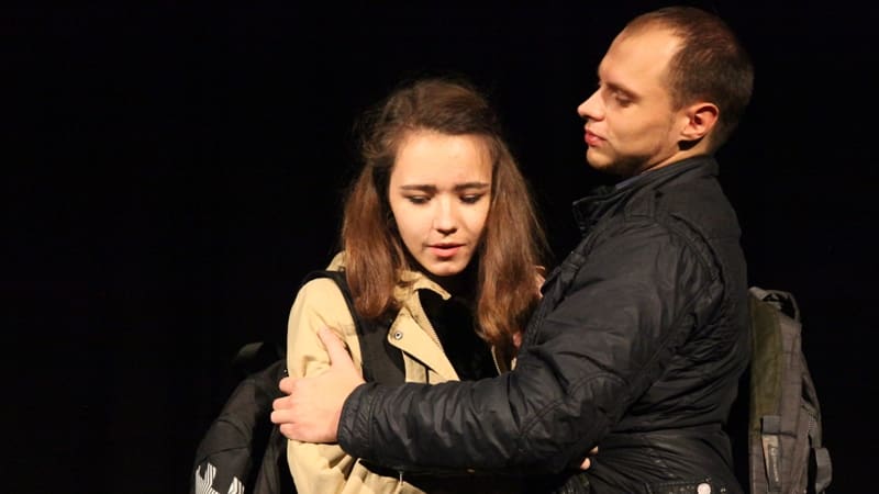 – Валентин Распутин, «Рудольфио». Театр «Кто мы?», ангарский лицей № 2, режиссёр Николай Щербаков. Помните этот ранний рассказ? Подобного потом у Распутина не представить; а вот и он не заслонён массивом знаменитых текстов, трогает. И зрители-первокурсники, впервые узнавшие, что у них в колледже (да и вообще в жизни) есть театр, притихли и вглядываются в странную девчонку с диковинным именем Ио. Она по рассказу латышка, а по мифу – возлюбленная Зевса, родившая ему в Египте славных героев и почитавшаяся там под именем Исиды. Но вот – ещё до всех своих сказочных приключений – она влюбилась 1 октября в энергоколледже в скучного Рудольфа, соединила с ним своё имя, не была услышана и исчезла. Хорошо бы режиссёру не заземлять героиню, не заставлять её старательно и долго переобуваться (оставьте тапочки Рудольфу!), не зависеть от назойливого «настоящего» телефона… А Ио (Алиса Орлова – тоже сказочное имя!) – запомнится.