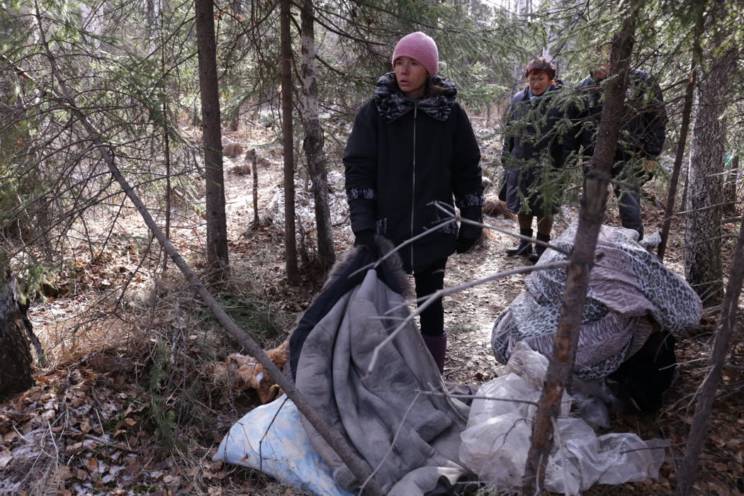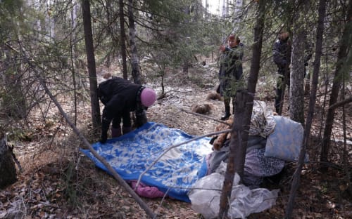 Марина показывает под навес из накренившейся ёлки. Там видно небольшой холмик из листвы. Марина смахивает её в сторону – и на свет появляется валиком сложенный ком тряпья, накрытый полиэтиленовым полотном. Она начинает стелить – матрас, несколько старых шуб, ватные одеяла, даже подушка.