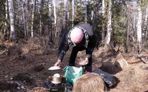 – Ложимся, накрываемся, если идёт дождь – на дерево натягиваем целлофан, – Марина произносит «салофан».