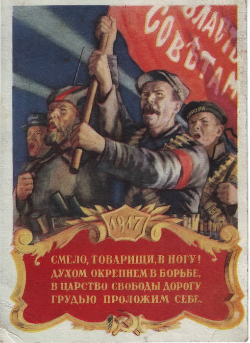 Открытка политическая, агитационная. С одной стороны, этого «бумажного хлама» вокруг нас много, с другой – лучшие образцы политической агитации быстрее всего идут в мусор. В семейных коллекциях открыток мы скорее найдём старые новогодние открытки, первомайские, на 8 Марта. А вот наиболее идеологически «нагруженные» – к 7 Ноября, например, обычно легко выбрасывали. Все мы много раз наблюдали скучные и во многом вторичные экземпляры «октябрьских» открыток конца 1970–1980-х годов и часто не знаем, как всё начиналось. Какими необычными и красочными были открытки, когда память об октябрьском перевороте ещё не была заменена клише и штампами.