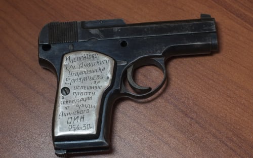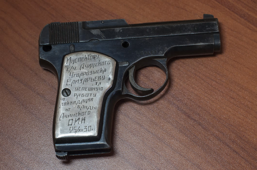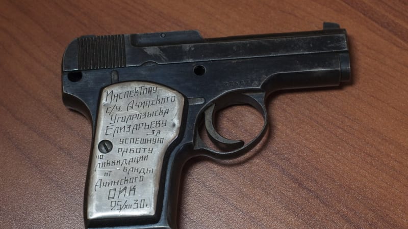 Дарственная надпись на рукояти как раз говорит о том, что оружие было вручено оперативнику. Однако проследить историю тут сложнее, чем с ТТ Трояновского. Выгравирована только фамилия инспектора угрозыска, без инициалов: «Инспектору с/ч Ачинского уголрозыска Елизарьеву за успешную работу по ликвидации банды. От Ачинского ОИК. 25.XII.30». Однако есть указание на Ачинский угрозыск, и дата примечательная – 1930 год. Если обратиться к истории тех лет, то установим, что с января по июнь 1930 года Ачинский угрозыск в тяжёлых условиях, проведя несколько операций, потеряв много сотрудников, совместно с коллегами из Хакасского округа наконец уничтожил хорошо организованную шайку, возглавляемую бандитом Пимщиковым–Озёрных. Видимо, инспектор Ачинского угрозыска Елизарьев был среди тех, кто отличился в этой операции, за что и получил именное оружие.