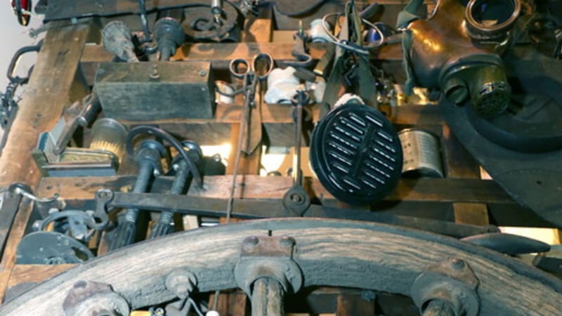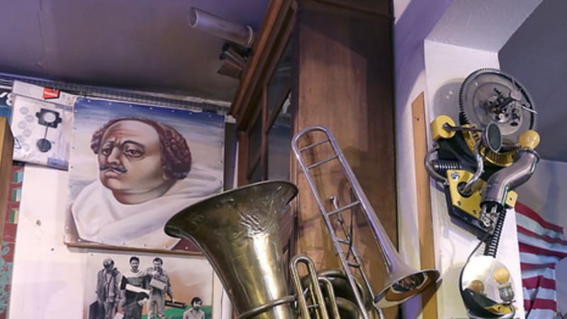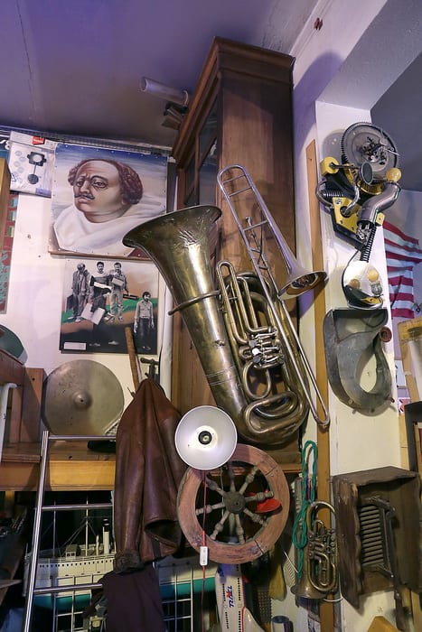 Один из центральных предметов мастерской Соколова – буфет начала прошлого века, самодостаточный и красивый. У него и имя собственное есть – Нотр-Дам. Дека от фортепиано подарена студентами художественного училища. Как-то они её умудрились занести на пятый этаж, место нахождения фортепианной деки осталось неизвестным. Керосиновые лампы, колесо от прялки, духовые медные трубы, чугунные утюги, железнодорожный фонарь, рабочий патефон – это лишь малая часть того, что можно увидеть в мастерской. Период собирательства одно время был таким бурным, что граничил с помешательством: