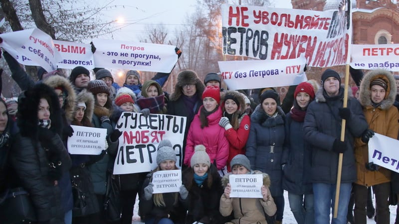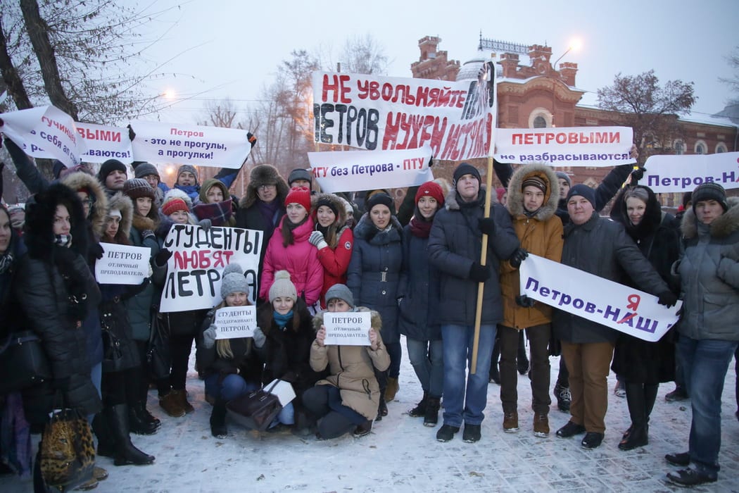 «Петров, давай, до свиданья! Твой универ» – такие открытки общественный деятель и краевед Алексей Петров раздавал на пикете, собравшемся у памятника Александру III 16 ноября. На каждой Петров расписывался. Пикет-поддержка сразу превратился в пикет-пост­фактум. За 40 минут до его начала Алексей Петров был уволен решением ректора, в этот же день профком проголосовал за то, чтобы оставить заместителя декана истфака на работе. На пикете собралось около 200-220 человек. Это были студенты, преподаватели, постоянные участники проекта «Прогулки по старому Иркутску», представители партии «Яблоко», в толпе мелькали люди от КПРФ, «Демократического выбора», представитель «Гражданской платформы» Владимир Матиенко.