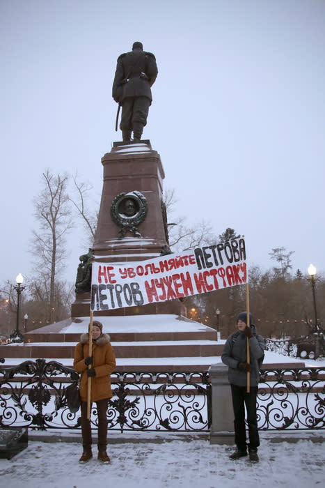Некоторые поднимались на импровизированную табуреточку и говорили речи. Особенно трогательными были старики, которые благодарили Алексея Петрова за «Прогулки по старому Иркутску». Было весьма холодно, шёл снег, с Ангары дул сильный ветер, но студенты и бабушки стойко стояли с плакатами. В это же время в местной сети «Фейсбук» можно было наблюдать других друзей изгнанного Алексея Петрова. Один из местных пиарщиков сфотографировался под пальмами на пляже. Вместе с друзьями в полосатых трусах и летних майках он кокетливо держит плакатик «Петров, мы с тобой!». В антураже сумерек, воющего ветра и снега над пикетчиками это послание  смотрелось странно.