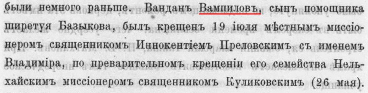 Как сообщал архимандрит Мелетий, несколько ранее Санданова и Кузменова были крещены два других ламы того же дацана. И вот тут появляется имя Вандана Вампилова – и, что интересно, в связи с помощником ширетуя Базыковым. «Вандан Вампилов, сын помощника ширетуя Базыкова, был крещён 19 июля местным миссионером священником Иннокентием Преловским с именем Владимира, по предварительном крещении его семейства Нельхайским миссионером Куликовским (26 мая). Первый шаг всегда труден. Долго колебался и Вампилов, пока благодать Божия, изменяющая сердца и утробы, не коснулась его сердца к умягчению и исцелению, а не к ожесточению, в котором гибнут тысячи их собратьев. Замечательно, что Базыков в сознании превосходства св. православной веры усердно помогал крещению как внучат своих, так и сына Владимира и сам, как видно, не далёк от царствия Божия», – писал архимандрит Мелетий.
