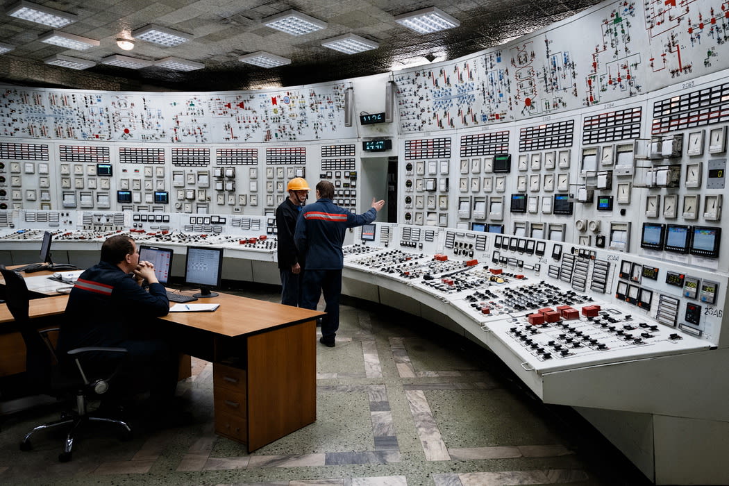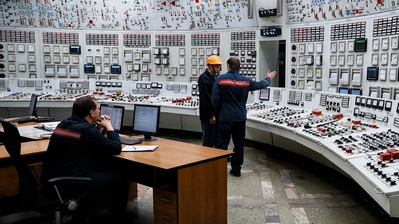 «Можно сказать, что главный щит управления используется для связи с сетями, – говорит заместитель начальника ПТО, когда мы заходим на один из блочных щитов управления. – С него, конечно, тоже можно отключить оборудование, но в основном общестанционное. А отсюда идёт непосредственное управление всеми механизмами, которые участвуют в работе энергоблока». Таких щитов всего три, по одному на два блока. Внутри – те же панели светлых тонов, на которых заметна частичная замена старых аналоговых приборов современными цифровыми. Для сохранения некоторых старых приборов есть веская причина – любое отклонение стрелки от нормы сразу бросается машинисту в глаза, в отличие от цифр на мониторе, отображающем несколько параметров. К слову, на блочном щите управления работают старший машинист и два машиниста (по одному на каждый энергоблок), в подчинении у которых по два обходчика: один обслуживает котёл, другой – турбину.