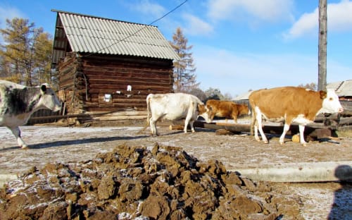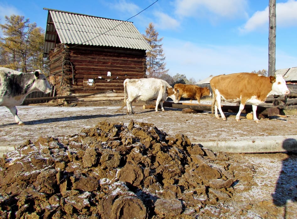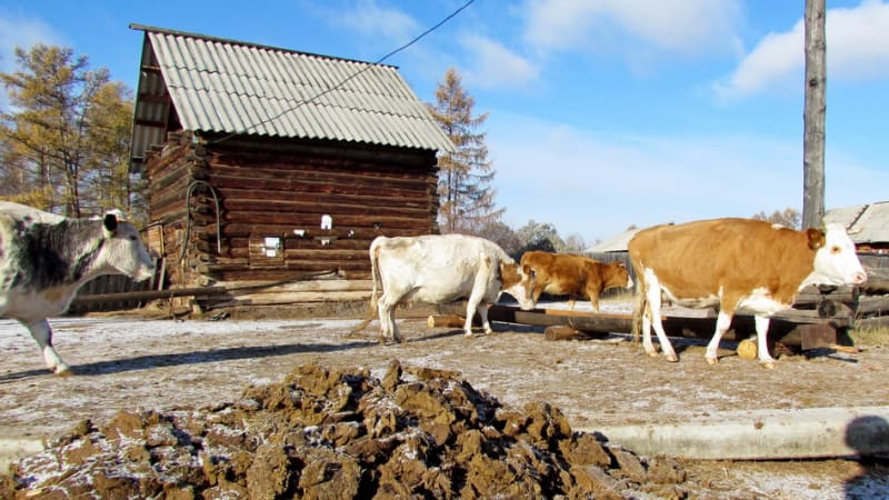 Судя по мёрзлым коровьим лепёшкам, собранным в одну кучу, создаётся некоторая видимость, будто источник питьевой воды для населения не совсем уж бездумно брошен на коровий произвол