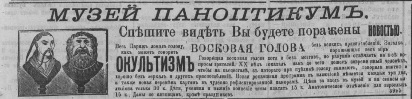 В те времена кинематограф был главной новинкой, но публика ещё желала к движущимся картинкам и механических оракулов, и говорящие головы. И владельцы иллюзионов её не обманывали. «Весь Париж ломает голову: как она может говорить? Говорящая восковая голова хотя и без мозгов, но разумно отвечает на все вопросы зрителей», – гласила реклама одного из иллюзионов. Обещали снять голову с пьедестала, чтобы показать: под тумбой не сидит человек, нет каких-либо оптических эффектов, а голова разговаривает, вот до чего дошёл XX век. «Проездом через здешний город на короткое время остановилась хиромантка» – под расписной вывеской в балагане толпились женщины. Всем хотелось узнать свою судьбу, а хиромантки были непременным атрибутом праздничного карнавала.