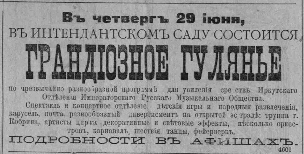 Хотелось бы, конечно, заглянуть хотя бы одним глазком на Тихвинскую площадь тех времён. Известно было, что во время пасхальной недели народ на центральной площади выпивал по 50 вёдер вина в день. Комический театр господина Струзберга, акробатические, гимнастические упражнения госпожи Раппо и Ко, марионеточный театр, петрушки, «панорамы», карусели – всё это составляло праздничный антураж Иркутска образца 1888 года. В газетах сетовали, что вместо таких развлечений лучше было бы сделать в городе «истинно народный театр», но до этого, как всегда, не доходили руки, так же, как и век назад, жаловались на отсутствие на оный денег.