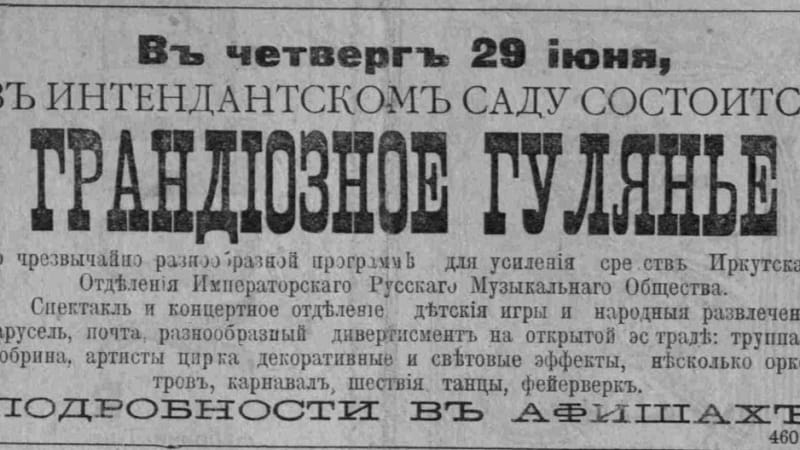 Иркутская публика была жадна для развлечений, поскольку и век назад, и ныне, несмотря на свои амбиции столицы Восточной Сибири, горожане не были избалованы разнообразием столичных увеселений. В один из дней августа 1905 года иркутяне устроили столпотворение на вокзале, и без того переполненном. Привлёк всеобщее внимание уходящий за Байкал поезд. В поезде везли… громадных размеров живого страуса. Бедный страус испугался и всё прятал свою несчастную голову под крыло, так что натёр себе шею… А публика веселилась, дивясь на невиданное животное. Однако стоит признать, что век назад увеселения для населения были разнообразнее, чем те, что предлагают современные моллы.