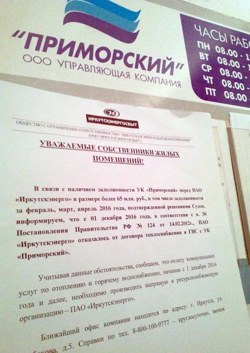 С 1 декабря ПАО «Иркутскэнерго» в одностороннем порядке расторгло договор теплоснабженения с крупнейшим в сфере ЖКХ в Иркутске должником – ООО УК «Приморский». Оплачивать горячую воду и отопление клиентам УК теперь следует энергетикам. В редакцию газеты обратились жители домов, которые обслуживает УК «Приморский», с вопросом: «Что делать тем, у кого долг за коммуналку?»