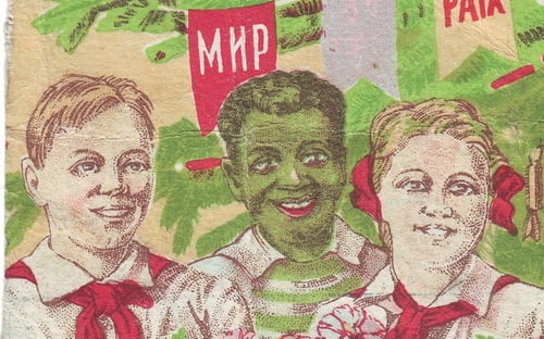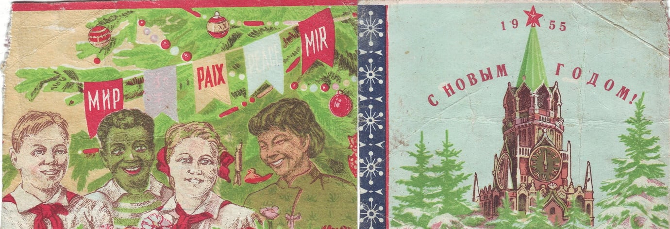 У меня в руках билет на новогоднюю ёлку. На одной стороне – башня с кремлёвскими курантами, надпись: «С Новым годом!» На другой – на фоне новогодней ёлки четыре ребёнка: русские мальчик и девочка, негр и китаянка. За их спиной наряженная ёлка и флажки с надписями «Мир», «Paix», «Peace», «Mir» и один фиолетовый – с китайским иероглифом, обозначающим всё тот же «мир». Над кремлёвской башней цифры – 1955. Всё это было 61 год назад. Позади были голодные послевоенные годы, и в середине 1950-х уже можно было «на работе у родителей» получить красочный билет на ёлку. А на ней раздавались вкусные подарки, набитые конфетами и фруктами. Там же можно было получить маски, шапочки – маленькие карнавальные подарки, которые большинству, как и мешки с конфетами, всё равно были пока недоступны.