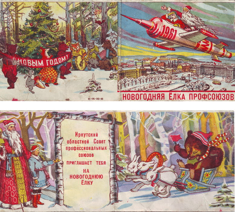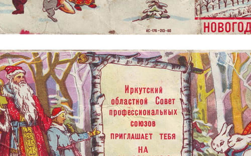 У билетика 1955 года есть «брат». Он младше ровно на шесть лет. И сохранился лучше. Этот билетик почти целый, он складной. На лицевой стороне – летящие на космической ракете Дед Мороз и юный Новый год, надпись на ракете: «1961 год». Всего несколько месяцев до полёта первого космонавта Юрия Гагарина. Внизу по кромке надпись: «Новогодняя ёлка профсоюзов». На обороте – пляшущие вокруг ёлки зверушки, а внутри – Дед Мороз и Снегурочка и надпись: «Иркутский областной совет профессиональных союзов приглашает тебя на новогоднюю ёлку». Если внимательно приглядеться к картинке на лицевой стороне, то поймёшь – это уже не стандартный общесоюзный тираж билетика, это работа иркутского художника. Ракета с Дедом Морозом несётся над площадью Кирова, видно здание Дома Советов, института иностранных языков…