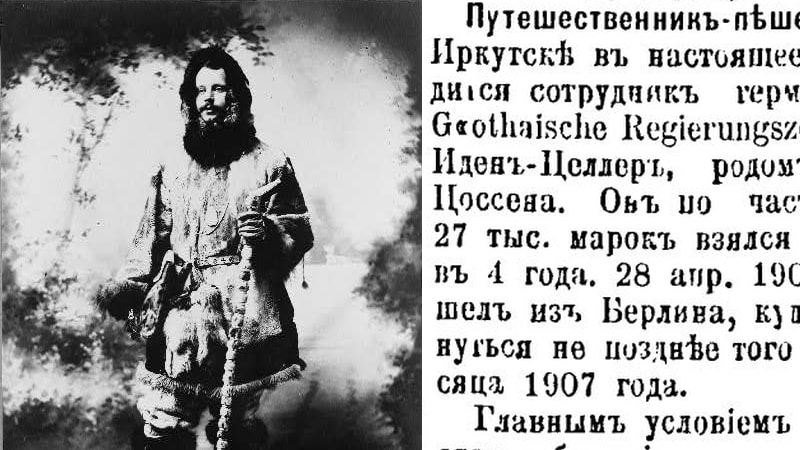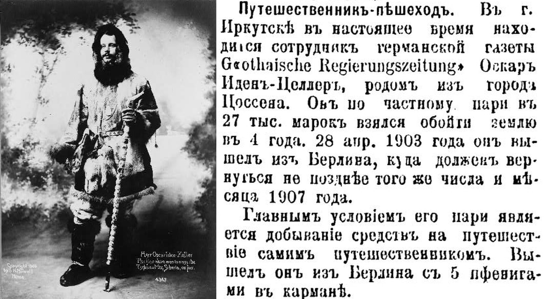 27 мая 1904 года в Иркутск ступила нога пешехода-путешественника, сотрудника германской газеты Gothaische Regierungszeitung (Правительственой газеты Готы) Оскара-Иден Целлера родом из города Цессена. Он отправился в путешествие по частному пари в 27 тысяч марок. Целлер обязался обойти Землю за 4 года. Покинул путешественник Берлин 28 апреля 1903 года, и должен был вернуться туда же 28 апреля 1907 года. Главным условием было то, что Целлер будет добывать средства на путешествие самостоятельно. Из Берлина путешественник вышел с пятью пфенингами в кармане. К моменту появления в Иркутске Целлер прошёл Данию, Швецию, Финляндию, Россию. По дороге из Москвы в Тулу побывал в Ясной Поляне, где был принят Львом Толстым, подарившим путешественнику свой портрет. Из Иркутска Целлер отправлялся в Маньчжурию, потом во Владивосток, Японию и Америку. Однако русско-японская война заставила его скорректировать планы и попытаться попасть в Америку через Якутию. Маршрут намечен был такой: Жигалово, Киренск, Витим, Олёкминск, Якутск, Верхоленск, Средне-Колымск, Нижне-Колымск и берег Берингова пролива, где немец надеялся сесть на китоловное судно и переправиться в Северную Америку. От Жигалова до Якутска предполагалось плыть на лодке. А оттуда – в Америку и Европу. Иркутские журналисты сочувствовали Целлеру: «Путешественник, очевидно, не имеет представления об условиях странствования по Якутской области, где для путешествий в его положении прежде всего нужны средства и средства. Пешком и без денег там далеко не уйдёшь». Целлер знал по-русски всего несколько слов, и иркутяне полагали, что доберётся он только до Якутска, а оттуда никуда не сможет двинуться, и ему придётся снова менять маршрут. Администрация Якутской области не соблаговолит помочь частному туристу и способствовать тому, чтобы инородцы бесплатно перевезли его через тундры. Между тем Целлер имел удостоверение № 6970 от 28 августа 1903 года от русского ведомства путей сообщения, которым предписывалось чинам ведомства оказывать помощь путешественнику. Но действовало ли оно в тундрах? Кто знает…