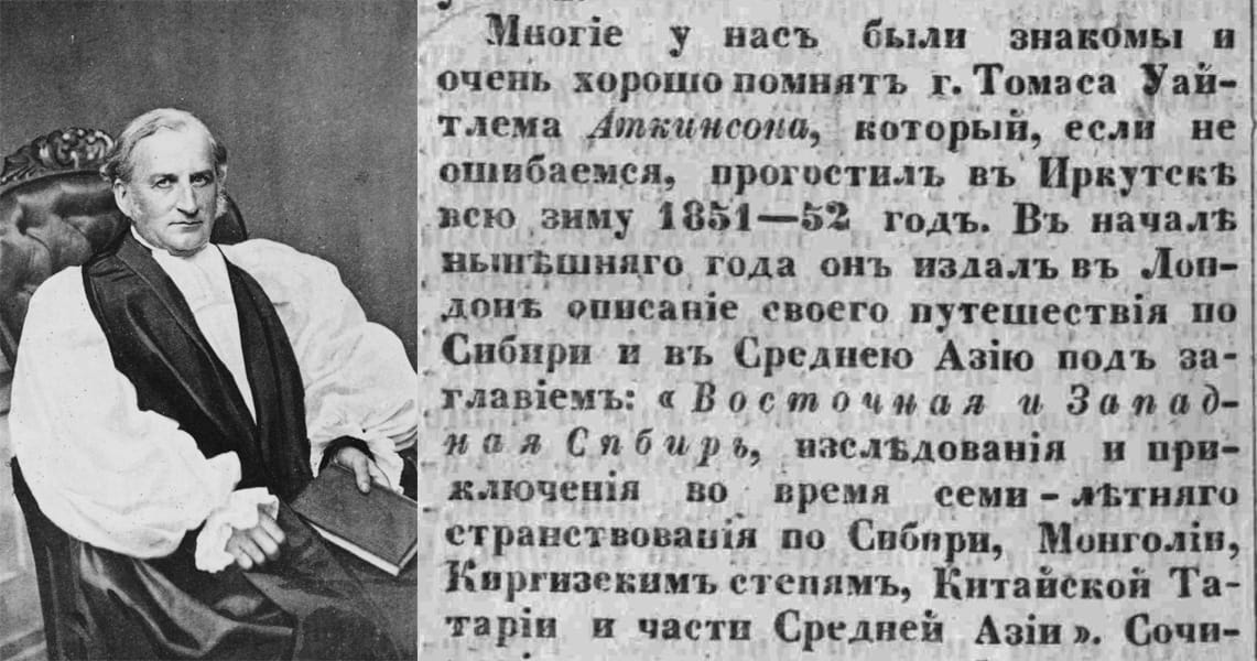 «Немало учёных, тружеников науки, отечественных и иностранных, посещали и описывали Сибирь… Но нельзя сказать, чтобы простые туристы, путешественники по охоте, были у нас явлением обыкновенным», – писали в 1858 году «Иркутские губернские ведомости». К 1858 году, как свидетельствовала газета, в Иркутске побывали только трое-четверо англичан, классических, отчаянных туристов. Ехали они в далёкий Иркутск не для каких-то исследований, а затем, чтобы записать в своём путевом журнале: был, видел, посетил. Или, как предполагал газетный автор, для того, чтобы «своим английским почерком нацарапать своё британское имя на какой-нибудь скале». Как свидетельствуют газеты, в Иркутске на 1858 год бывали господа-туристы с фамилиями Гиль, Аутсен, Аткинсон. Аткинсон был известным в Англии путешественником. Господин Томас Уайтлем Аткинсон гостил в Иркутске, предположительно, зимой 1851-1852 годов, сделал несколько живописных видов окрестностей города, на пути из нашего города общался с декабристами. Газета не даёт сведений, как Аткинсон проводил время в Иркутске, однако свидетельствует, что многие иркутяне его запомнили.