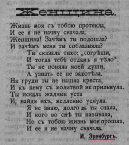 И наконец в 1911 году Эренбург печатает два стихотворения в «Сибирской мысли». Первое называется «Женщина» и начинается строчками: «Жизнь моя с тобою протекла, и её я не начну сначала. Женщина, зачем ты подошла? И зачем меня ты соблазняла?» Это стихотворение не встречается в собрании сочинений и в подборках стихотворений, не вошедших в сборники и не опубликованных отдельно при жизни автора. Точно так же не обнаружено нами в сборниках и подборках стихотворение, которое появилось в 1911 году в «Голосе Сибири», написанное Эренбургом от имени женщины. Оно начинается со строк: «Он уехал, ни стона, ни мольбы, ничего… Пресвятая Мадонна, я прошу за него!» Поскольку в стихотворении упоминаются атрибуты рыцарства, то, скорее всего, можно его отнести к стихам первого, «рыцарского сборника» Эренбурга. Однако в списке стихов сборника такого стихотворения нет.