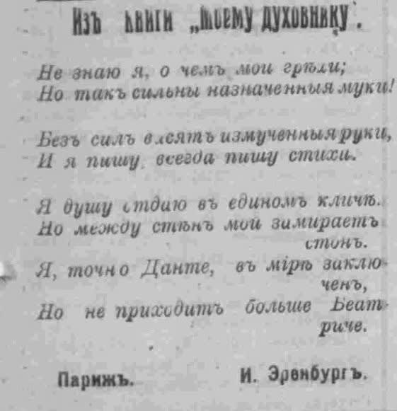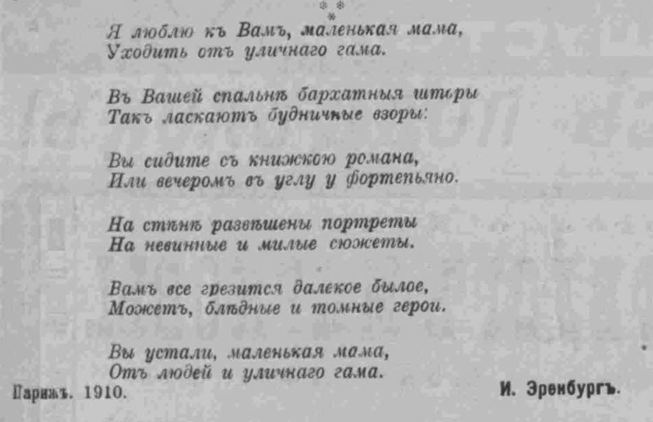 «Я люблю к Вам, маленькая мама, уходить от уличного гама. В вашей спальне бархатные шторы так ласкают будничные взоры…» – это посвящение неизвестной женщине на страницах «Восточной зари» 1910 года – первое из найденных нами стихотворений Эренбурга, напечатанных в иркутской прессе. Подписано оно, как большинство стихов, – «Париж, 1910. И. Эренбургъ».
