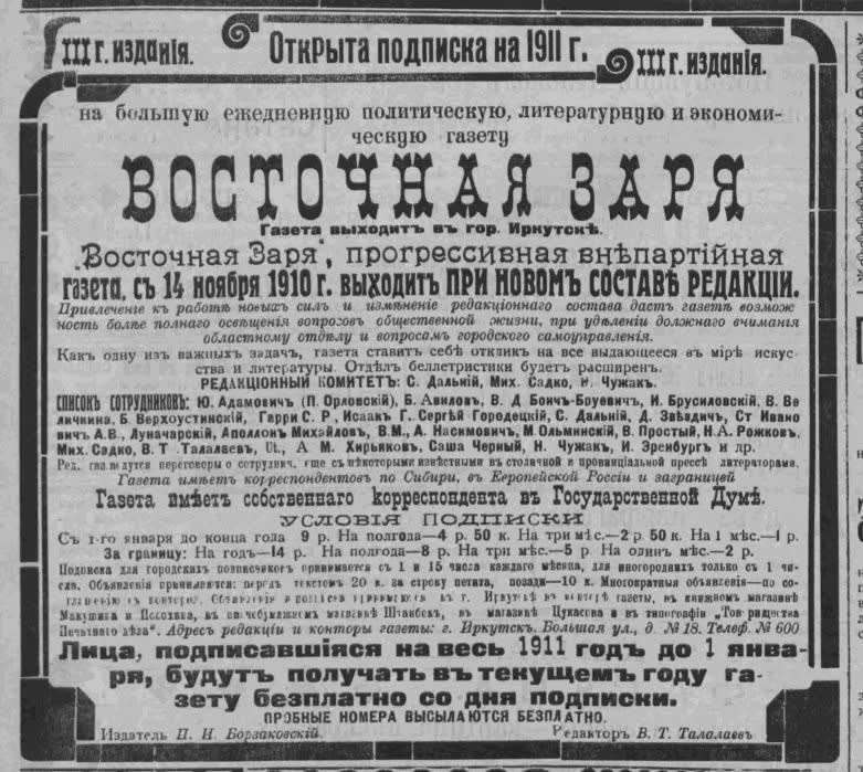 Прошло около полутора месяцев после отзыва Николая Чужака о парижском таланте, как в «Восточной заре» появилось объявление со списком сотрудников, которые сочли возможным писать в сибирскую газету. Среди них были и Луначарский, и Бонч-Бруевич, и Сологуб, и брат Николая Чужака поэт Александр Насимович, и депутаты Государственной Думы и многие другие. И среди этих фамилий значилось – И. Эренбург. Значит, осенью 1910 года Илья Эренбург вполне официально стал сотрудником «Восточной зари».