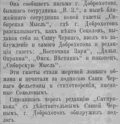 Михаил Доброхотов сообщал, что в своё время «Восточная заря» получила от Саши Чёрного письмо, в котором предлагалось сотрудничество. Газета согласилась, однако выяснилось, что под псевдонимом скрывался некто Соколов. Действовал он широко – вскоре стихи «Саши Чёрного» появились в «Далёкой окраине», «Омском вестнике». Как утверждал господин Доброхотов, даже в новую «Сибирскую мысль» попало стихотворение «Саши Чёрного». «Дальнейшее печатание произведений подставного Саши Чёрного редакция приостанавливает», – сообщила «Сибирская мысль» в самом конце ноября 1910 года. А вот «Восточная заря», напротив, решила ничего не приостанавливать. Даже после печати письма Михаила Доброхотова в «Сибирской мысли». И даже после разоблачения «подставного Саши» ещё и в газете «Сибирь» (та перепечатала письмо Доброхотова и Саши Чёрного, сопроводив всё это своими язвительными комментариями о торжестве плагиата в «Восточной заре»).