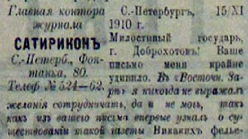 В ноябре из «Сатирикона», как утверждал Доброхотов, был получен ответ. Писал сам Саша Чёрный: «Милостивый государь г. Доброхотов! Ваше письмо меня крайне удивило. В «Восточной заре» я никогда не выражал желания сотрудничать, да и не мог, так как из вашего же письма впервые узнал о существовании такой газеты. Никаких фельетонов в «Восточную зарю» я никогда не посылал, и, т.о., ваши слова «Ваш фельетон разумеется принят и пойдёт» очень неприятно меня поразили. Не взял ли кто-нибудь напрокат мой псевдоним и не воспользовался ли им для присланного фельетона? За приглашение сотрудничать в «Сибирской мысли» очень вас благодарю, но я ведь не газетный работник, пишу мало и в настоящее время занят до весны большой работой. Не откажите в любезности поместить настоящее письмо в «Сибирской мысли», чтобы выяснить этим недоразумение, которое может возникнуть в случае напечатания в «Восточной заре» приписываемого мне фельетона. Примите уверение в совершенном почтении к вам, Саша Чёрный».