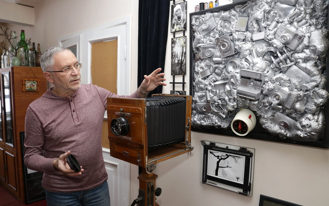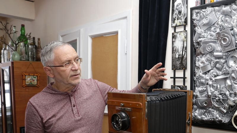 Работать в драмтеатр Анатолий Бызов пришёл ещё во времена плёночной эпохи. Ему тогда выделили помещение для лаборатории в здании старой музкомедии, куда временно переехала труппа. А после завершения реконструкции театра у фотографа появилось сразу две комнаты, которые он называет светлицей и темницей. Темница – это небольшая студия, тёмная комната, оснащённая оборудованием для съёмки. В светлице – стол с компьютером и прочими принадлежностями. Здесь же – россыпь старых фотоаппаратов на полке в шкафу, среди которых есть и редкие, например стереоаппарат «Спутник»; есть и один, можно сказать, антикварный аппарат, возрастом в сотню лет. В светлице же – большая камера под листовую плёнку размером 18х24 см, где-то начала 70-х годов прошлого века. «На большом формате при контактной печати получается такая пластика изображения, что никакая цифра не может пока этого достичь, – с почтением к раритету рассказывает Анатолий. – Плёнка более живая, более овеществлённая, в ней нет условности, заложенной в цифре. Поэтому плёночные фотографии совсем другие, более душевные». Точка притяжения в светлице – шикарная и оригинальная инсталляция, посвящённая чёрно-белой фотографии. В едином пространстве квадратной рамы собраны фотоаппараты, залитые монтажной пеной и выкрашенные серебристой краской. А в фоторамке, используемой когда-то для печати под увеличителем, вставлена готовая фотография (разумеется, чёрно-белая), и висит она на стене, как обычно вешают фотографию в рамке. Здесь же – лабораторные фоточасы, используемые когда-то их хозяином при проявке плёнки, и красный фонарь для печати снимков. Инсталляция создавалась постепенно, от замысла – к воплощению, зато сейчас вполне может украсить собой музей современного искусства или музей, посвящённый фотографии.