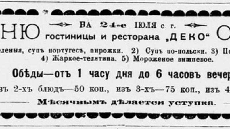 «Щи зелёные, суп португес, пирожки. Суп по-польски. Почки в мадере. Жаркое-телятина. Мороженое вишнёвое» – это дневное июльское меню 1903 года ресторана гостиницы «Деко». За два блюда нужно было отдать 50 копеек, за три – 75 копеек. Обеды шли с часу до шести вечера и сопровождались музыкой дамского духового и чешского струнного оркестров. Дивертисмент давали шансонетная певица Ульве-Дюфарен и куплетистка-чтец госпожа Чирская… А если «Деко» было не по карману, то можно было повернуть на 3-ю Солдатскую, ныне Грязнова, чтобы заглянуть в «Бристоль». Туда зазывали плохонькими, но стихами: «В Иркутске на Солдатской улице, что третьей называется, прекрасный ресторан «Бристоль» с отелем помещается». В стихотворной форме описывались все достоинства «Бристоля»: «оркестр недурной, также есть и пиано приличный», пара дышловых и собственная связь: «Есть телефон при «Бристоле», друзья! Сколько угодно болтайте!»