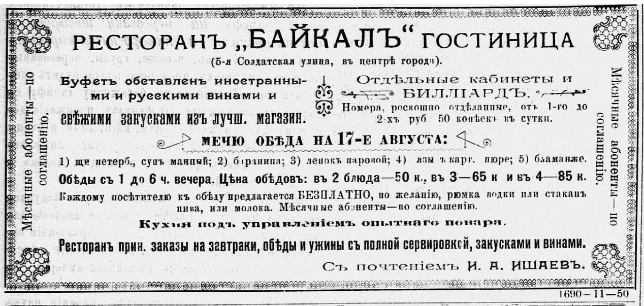 Нит Романов записал в октябре 1909 года: «Ресторанов первого разряда 6, второго – 14, кухмистерских с продажей пива – 8, пивных лавок – 81, меб­лированных комнат – 16, постоялых дворов – 50, кухмистерских без продажи пива – 16, дешёвых столовых – 16…» Конечно, сегодня мы можем узнать меню далеко не всех этих заведений, а наиболее значимых и престижных. То есть тех, что способны были дать рекламу в газеты. Одно из таких заведений располагалось на углу Большой и Тихвинской (ныне Карла Маркса и Сухэ-Батора). Когда-то здесь находилась гостиница «Деко» с одним из лучших иркутских ресторанов – с электричеством, с оркестром. На углу Большой и 6-й Солдатской (Карла Маркса и Литвинова) сиял огнями «Гранд-Отель», тоже славившийся своей кухней. «Байкал», что на 5-й Солдатской (Богдана Хмельницкого), завлекал посетителей бесплатной рюмкой водки, стаканом пива или молока по желанию… «Метрополь» в 1910 году имел свой «american bar» и особую «изюминку» – человека-вarman, «владе­ющего русским, польским, немецким и английским языками». «Империал» одевал прислугу «в оригинальные костюмы». Между гостиницами шла жёсткая конкуренция, поэтому гостей встречали уже на вокзале, наиболее успешные имели собственный омнибус. Подкупали извозчиков, чтобы те везли в нужное место. «Метрополю» и «Континенталю» даже пришлось разместить объявление: «Извозчикам не верить, что все номера заняты или ремонтируются».