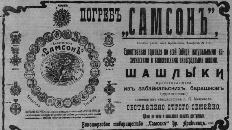 Примерно в 1909–1912 годах в иркутских меню появляются «шашлыки из курагашки». Своеобразный симбиоз кавказской кухни и местного сырья. «Шашлык из молодого курагашка» изготовляли, к примеру, при «Погребе кахетинских вин «Алаверды», что располагался в доме Иодловского на Большой. То же блюдо готовилось и в винном погребе «Самсон», располагавшемся там же, на Большой, в доме Кринкевича. Хозяева предупреждали: «Шашлыки безусловно из курагашка». Курагашек подавали в новом ресторане «Националь» на углу Тихвинской и Большой. Курагашек, как поясняли местные газеты, – это забайкальский барашек около 3 месяцев от роду. А вот шашлыки готовили исключительно мастера с Кавказа. У «Самсона», к примеру, это был «знаменитый специалист Я. Метревели».