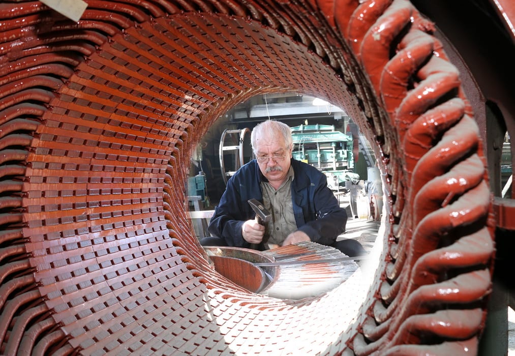 В следующем цехе ревизуют электрические машины. Просто для справки: в движение ЭШ 20/90 приводят 11 двигателей суммарной мощностью почти 9,6 МВт. Так, механизм поворота работает за счёт четырёх моторов по 250 кВт, ещё два по 800 кВт обеспечивают ход. За подъём ковша отвечают два движка по 1,12 МВт, такой же мощности установлены двигатели на привод тяги. Наконец, главный сетевой двигатель выдаёт 2,5 МВт. Каждый мотор состоит из множества деталей, сюда следует добавить множество единиц другого электрического оборудования. Их ремонт тоже требует немало времени и сил. Так что работой в ближайшие месяцы цех будет обеспечен.