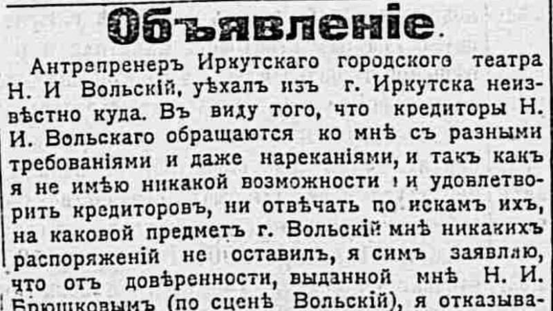 Пригласивший Брагина в труппу мещанин Николай Иванович Брюшков-Вольский тоже был доволен. Залы были переполнены, на московские оперные таланты люди шли. Сезон был блестящим. Однако уже в 1904 году что-то пошло не так. Вольский вдруг стал фигурантом судебных тяжб. В суд подавали артисты. В самом начале 1904 года в камере мирового судьи 1-го участка слушали дело актёра Чижина к антрепренёру Брюшкову. Брюшков уволил актёра из-за нарушений контракта. Чижин плохо знал роли, а в пьесе «Кин» и вовсе вышел на сцену в панталонах, которые «грешили против исторической правды на несколько вершков», то есть были длинны. Чижин, несмотря на грешные панталоны, требовал с антрепренёра заработанное за 20 дней и компенсацию за увольнение. В итоге стороны после нескольких изнурительных процессов заключили мировое. Летом Брюшков набрал новую труппу на западе России и уверял через газету, что актёрам нечего волноваться, в городе всё спокойно… А в октябре поползли слухи, что баритон Корсаков, который был удалён из труппы по требованию дирекции, подаёт в суд на Вольского, чтобы получить неустойку. В конце 1904 года уже другой актёр, Яковлев, судился всё с тем же Брюшковым-Вольским. Антрепренёр уволил его по требованию труппы, так как актёр некорректно себя вёл при столкновении с актёром Цветковым в ресторане гостиницы «Россия». В итоге суд встал на сторону Яковлева и присудил взыскать с антрепренёра 200 рублей в его пользу за преждевременно разорванный контракт. Конечно, такая слава Брюшкова среди актёров не могла кончиться ничем хорошим. Оперные артисты, нанятые им, уже начали волноваться за собственные гонорары. Но в Иркутск всё равно ехали…