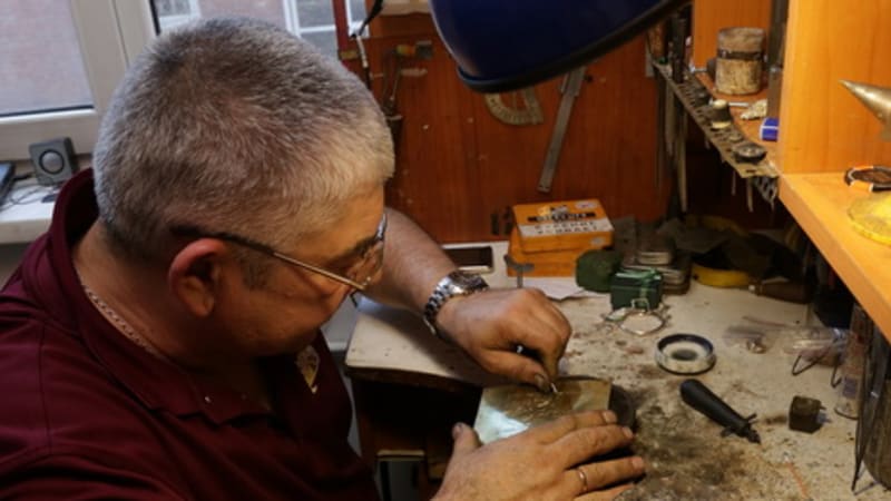 Я научился ремонтировать и бижутерию. Сегодня женщины носят много бижутерии, и это не дешёвая пластмасса, это обычно красивые и добротные изделия. Жена Татьяна, мой партнёр и коллега, овладела искусством чинить бусы. Я освоил заточку ножей и ножниц, ремонт пряжек на сапогах. Ювелирка ювелиркой, а от повседневных бытовых изделий никуда не деться. Иногда приносят на починку нетривиальные вещи – например, стриптизёрские металлические стринги из цепочек. Иногда ветераны отдают починить свои медали (это мы делаем бесплатно). Кому-то нужна гравировка, памятные надписи. Многие в городе делают их лазером, но такие буквы не получаются объёмными. Я гравирую вручную на бор-машине, это совсем другой эффект. Кому-то нужно сделать серьги к кольцу и наоборот, чтобы получился комплект. Клиенты приносят картинки, наброски, и мы делаем то, что им хочется. Недавно материализовали интересный крупный перстень-печатку, который существовал только в воображении клиента и на бумаге.