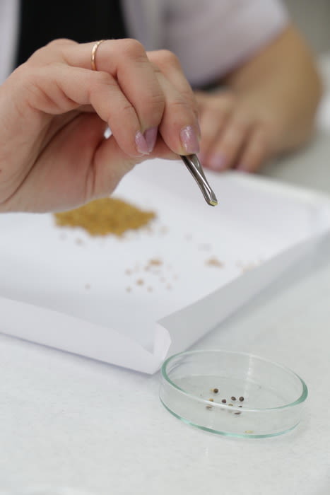 Она высыпает горсть семян горчицы из пакета в лоток, застеленный белой бумагой, разгребает его ровно шпателем и начинает выбирать лишнее пинцетом, откладывая семена сорных культур в чашечку Петри – потом пойдут на идентификацию.