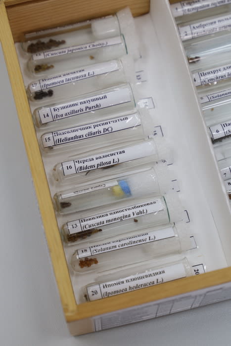 – Вот, посмотрите сами: горчак в горчице видно сразу не вооружённым глазом, – Марина показывает – среди жёлто-коричневых круглых семян горчицы виднеются продолговатые и белёсые, как рис для плова, зёрнышки горчака. – Нам нужно определить степень засорённости – считаем, сколько семян горчака в ста граммах образца, и пересчитываем на килограмм. На днях в одном из принесённых людьми килограммовых пакетов оказалось 130 семян – это очень много!