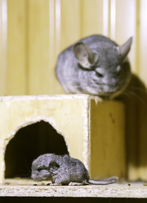 Недавно шиншиллы снова принесли потомство – двух малышей. Как и у морских свинок, дети у шиншилл рождаются уже полностью сформированными. Они зрячие, бегают, покрыты шёрсткой, то есть имеют вполне товарный вид. Именно поэтому в помёте у шиншилл детёнышей мало, в отличие от крысят, которых может родиться 15 за раз.
