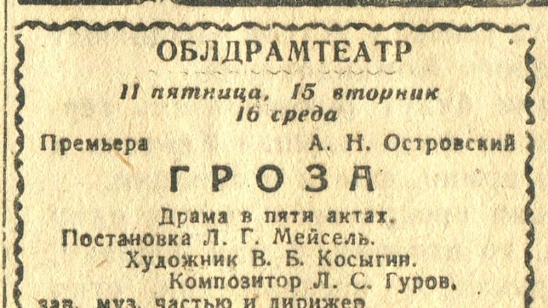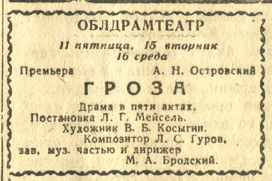Но это ещё не всё. В драматическом театре была осуществлена постановка «Грозы» Островского, музыку к которой написал Леонид Гуров. Владимир Сухиненко расценил её как удачную работу композитора, отметив мелодичность гуровских сочинений, созданных для спектакля. Кстати, «Гроза» была одним из спектаклей, шедших в театре в первые послевоенные дни. В нашей семье как своеобразная реликвия сохранился номер «Восточно-Сибирской правды» от 11 мая 1945 года. Газета выходила ещё в двухстраничном формате, что было обусловлено экономией военного времени. И вот в нижней части второй страницы читаем, что 11, 15 и 16 мая в театре идёт «Гроза». Таким образом, гуровская музыка сопровождала иркутян в эти радостные майские дни.