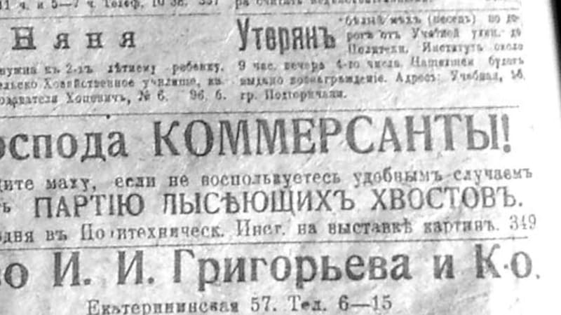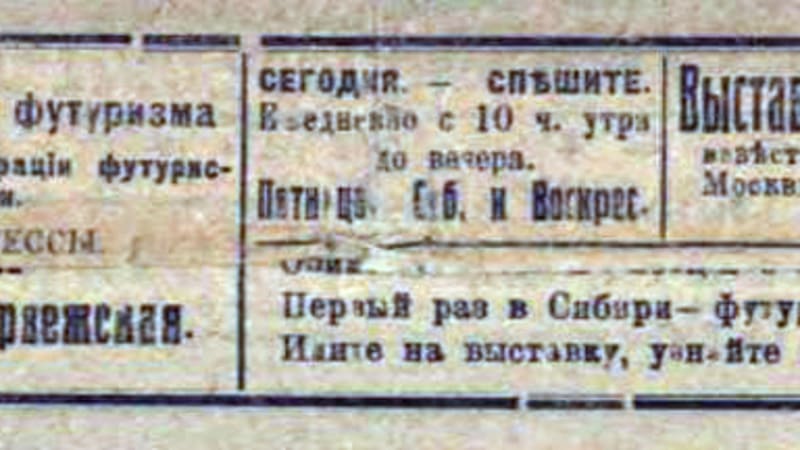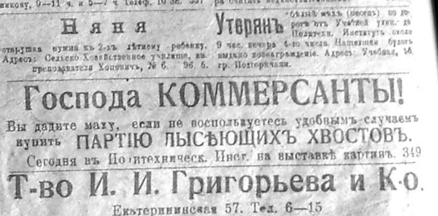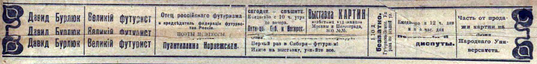 16 мая в помещении Народного университета на углу Пятой Солдатской и Власовского переулка снова открылась «первая показательная» выставка картин петроградских и московских футуристов, как сообщалось в афише, «по желанию публики и местных художников». Отец российского футуризма в 12 и 15 часов ежедневно обещал «пояснения и диспуты». Евгений Спасский позже вспоминал, как обычно проходили эти «пояснения». Сначала Бурлюк и компания в эпатирующих одеждах гуляли по городу, собирая толпу (об этом сохранились и воспоминания иркутян. – Авт.), а потом вели всех на выставку. «Поднимался страшный шум от недоумения перед футурокартинами, и обычно нас просили с интересом, а часто и с возмущением дать пояснения картинам. Тогда Додя обращался ко мне и просил сказать несколько слов о новом течении в искусстве и объяснить непонятное. Но, как я только кончал говорить, он тотчас появлялся со шляпой в руке и, обходя всех, говорил: «Всякий труд должен быть оплачен». И собирал порядочную сумму». 16 мая на выставке прошёл второй футуристический диспут по вопросам нового искусства. В иркутских афишах, к сожалению, мы не обнаружили сообщений о знаменитых «лысеющих хвостах». Месяцем ранее в Омске Бурлюк с удовольствием сообщал господам коммерсантам в «Сибирской речи», что на выставке «продаётся партия лысеющих хвостов» (его собственная книга стихов. – Авт.). Причём это сообщение было не в блоке культурных новостей, а в блоке частных объявлений вместе с «коровами» и продажей молока.
