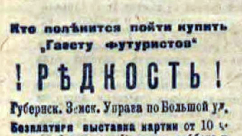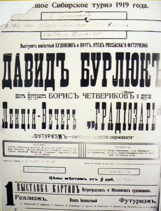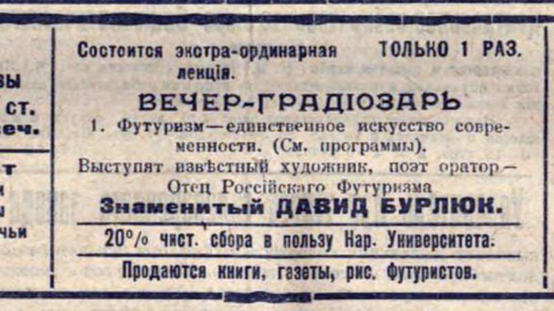 «Поэты! Предложен конкурс на звание «Короля байкальской поэзии» и денежную почётную премию 300 руб. по присуждению публики» – это объявление в мае 1919 года появилось в иркутской газете «Наше дело». Конкурс проводил не кто иной, как «отец российского футуризма» Давид Бурлюк. Иркутские гастроли знаменитого футуриста вызвали гнев просвещённой публики, и один из критиков, побывав на выставке Бурлюка и товарищей, разразился язвительной статьёй. «Маяковский, Хлебников, Божидар, Большаков, что сделаете вы с «папашей российского футуризма»? – вопрошал критик. А Додя, Додичка Бурлюк, тем временем расписывался на картинах: «Академическую картину можно подделать, футуристическую нельзя, она – чек».