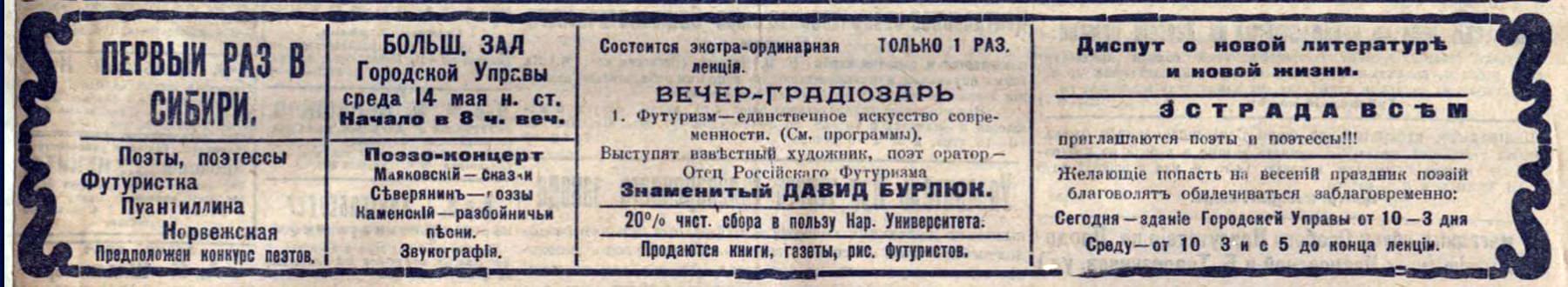 14 мая Давид Бурлюк в большом зале городской управы устроил «Вечер-грандиозар», начинавшийся в восемь часов. С «экстраординарной» лекцией выступал сам Бурлюк, в афишах скромно поименованный «известным художником, поэтом, оратором» и, конечно же, Отцом Российского Футуризма (орфография сохранена. – Авт.). Иркутянам был представлен доклад на тему «Футуризм – единственное искусство современности». А футуристка Пуантиллина Норвежская с товарищами читала сказки Маяковского, поэмы Игоря Северянина, разбойничьи песни Каменского. В этот же вечер состоялся диспут «о новой литературе и новой жизни». Открытая эстрада была предоставлена всем желающим поэтам и поэтессам. На выставке продавались книги, газеты и рисунки футуристов. «Желающие попасть на весенний праздник поэзий благоволят обилечиваться заблаговременно», – гласила афиша.