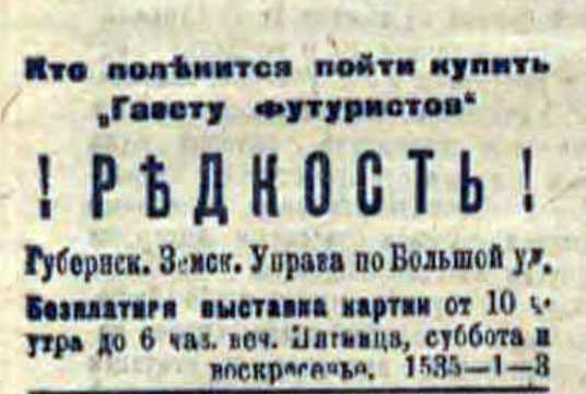 Из этой короткой заметки мы можем немного представить, как читались лекции футуристов в Иркутске. Критиком приведены фразы, видимо, звучавшие на лекции из уст Бурлюка: «Девушка – аромат весны», «академическую картину можно подделать, футуристическую нельзя, она – чек». Судя по описанию, Бурлюк и товарищи ставили на свои картины автографы, сравнивая их с государственными билетами, или чеками, что и возмутило анонимного критика. «Вы, молодые мэтры футуризма – Малевич, Татлан, Розанова, Ле-Дантю, все настоящие, что сделали бы вы с «отцом российского футуризма»?» – спрашивал аноним. Критик ознакомился с газетой футуристов, распространяемой на выставке, и тоже остался недоволен. Он сообщал, что напечатанные в ней вещи Маяковского и Каменского «давно известны по «Стрельцу», «Барабану», «Пощёчине общественному вкусу», «Простому как мычание». И намекал, что «Газета футуристов» пренебрегает авторским правом, не указывая первоисточники. «Маяковский, Хлебников, Божидар, Большаков, что сделаете вы с «папашей российского футуризма»? – снова и снова обращался критик к авторитетам (Божидар – псевдоним Богдана Гордеева, поэта, близкого к «Центрифуге». Константин Большаков – поэт-футурист. – Авт.).